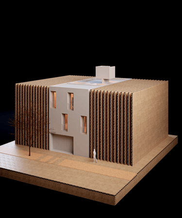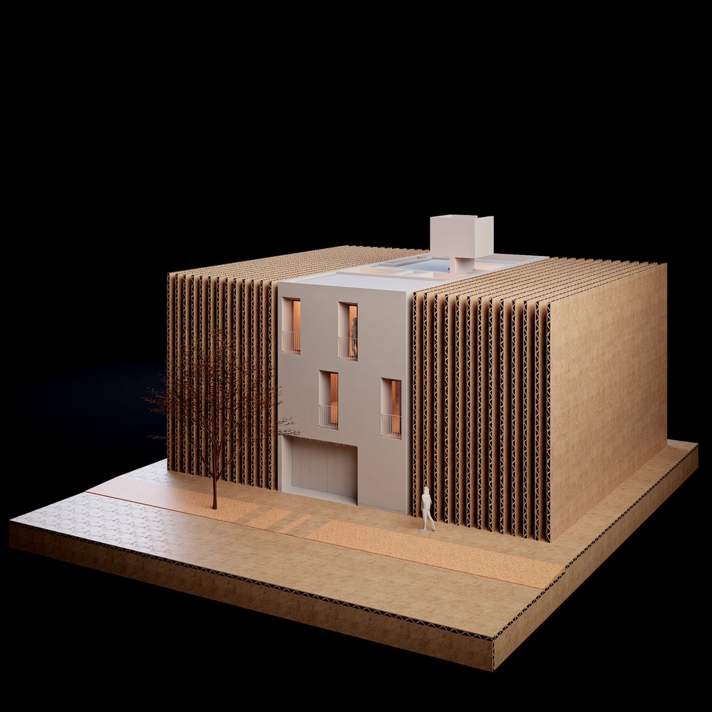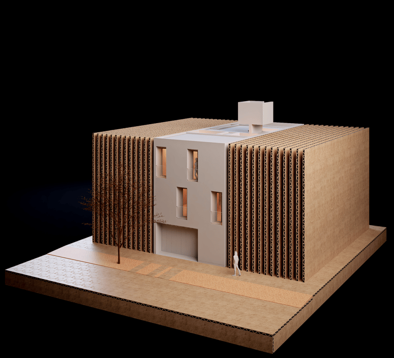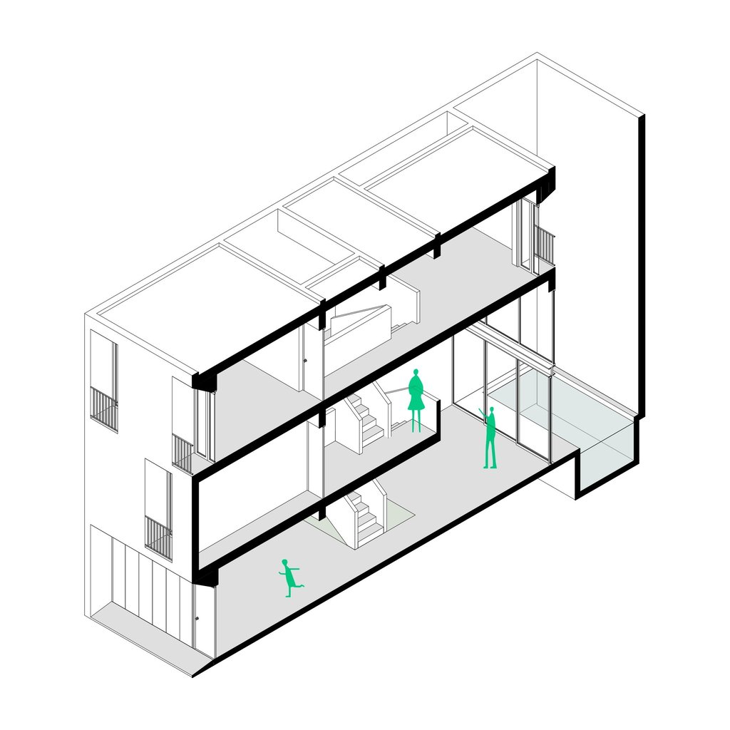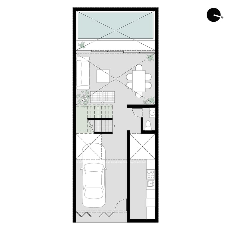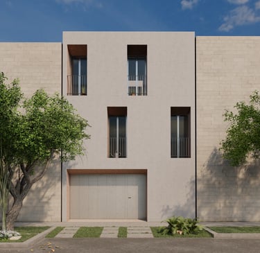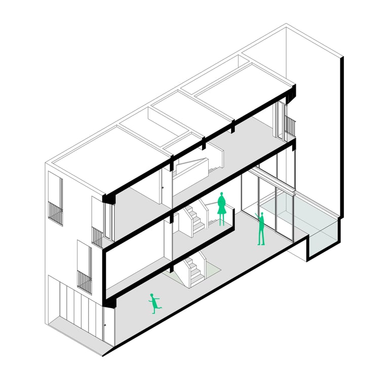 Vivienda temporal desarrollada en tres niveles sobre un lote de 90 m², concebida como un refugio que enfatiza la dualidad interior–exterior: una envolvente cerrada hacia el exterior y una fluidez espacial en el interior.