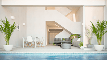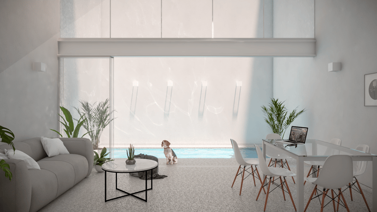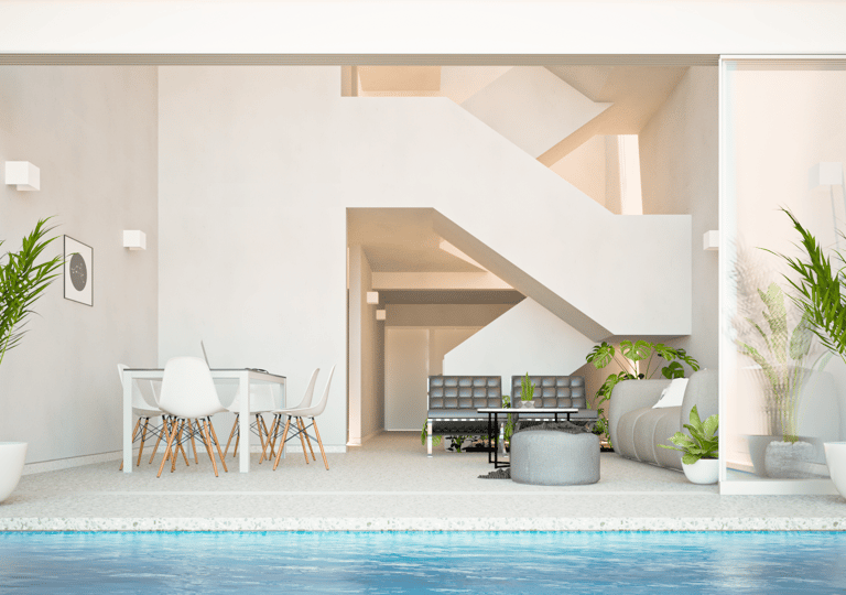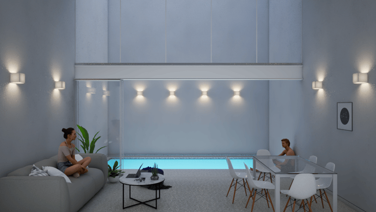 En respuesta al asoleamiento, los vanos exteriores se plantean retranqueados, permitiendo un control solar. Asimismo, con el objetivo de potenciar la amplitud espacial, se incorpora una doble altura en la zona social, reforzando la relación con la piscina.