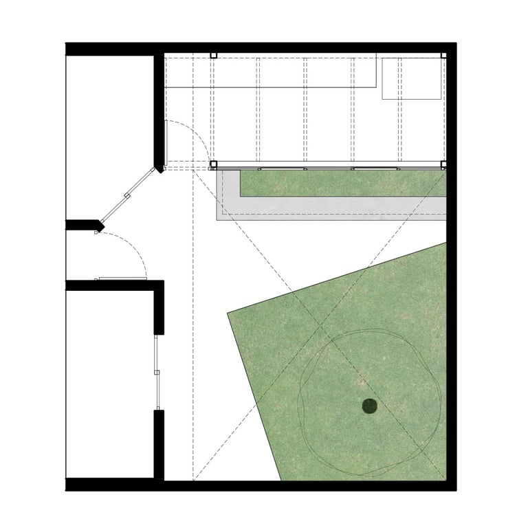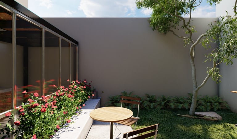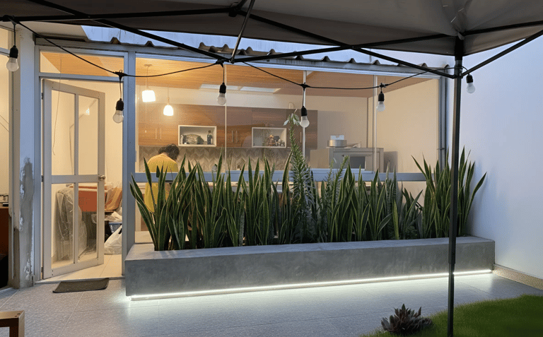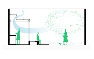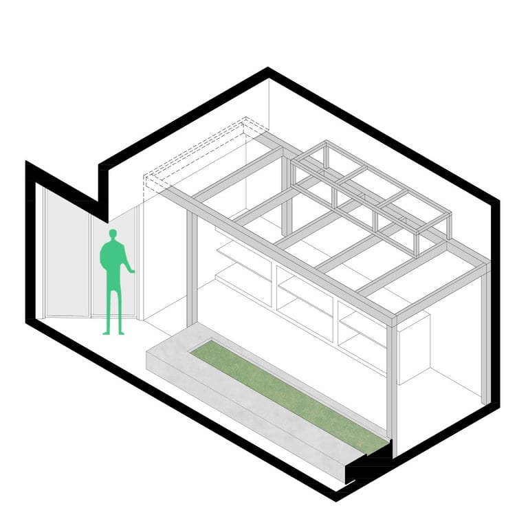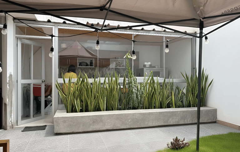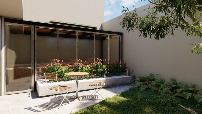 Para favorecer las condiciones ambientales, se propuso la incorporación de una teatina que permite optimizar la ventilación cruzada. Asimismo, se diseñó una jardinera de concreto con una función dual: actuar como elemento de transición y filtro entre el interior y el exterior, y funcionar a su vez como banca o espacio de estancia al aire libre.