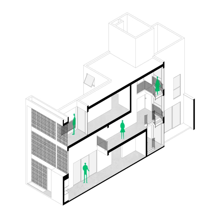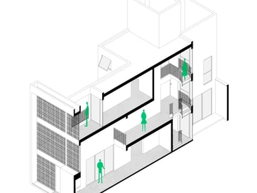 A partir de esta premisa, el diseño busca generar una percepción de amplitud mediante una secuencia espacial continua, basada en estrategias de dilatación y compresión espacial, que enriquecen la experiencia del recorrido y jerarquizan los distintos ambientes de la vivienda.