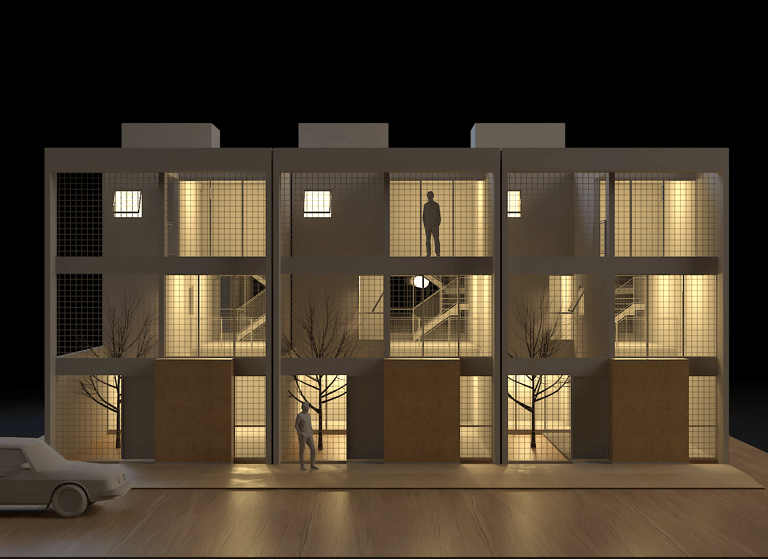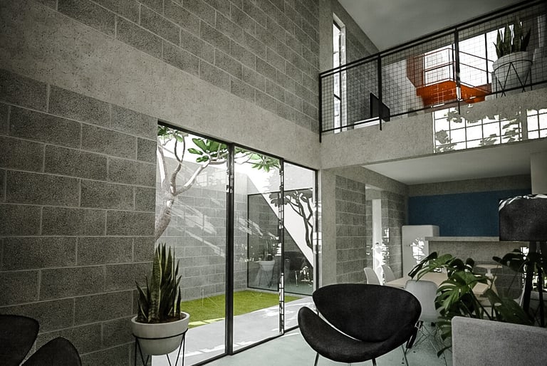 El proyecto de vivienda unifamiliar se desarrolla en un lote medianero de 90 m², condición que plantea el desafío de optimizar un área reducida sin comprometer la calidad espacial.