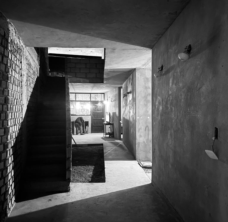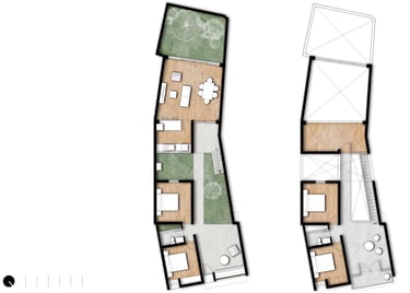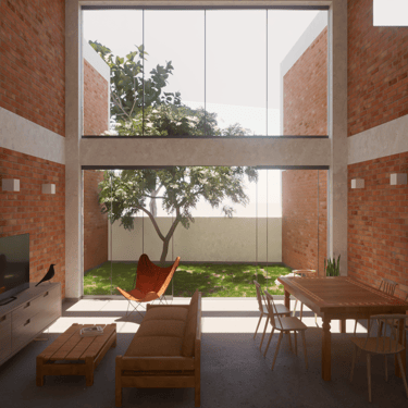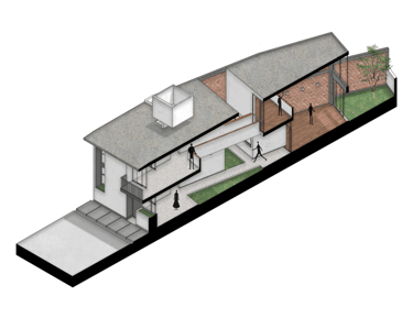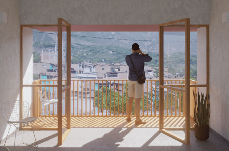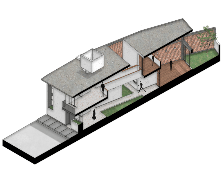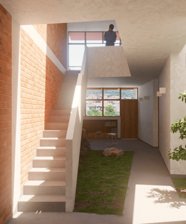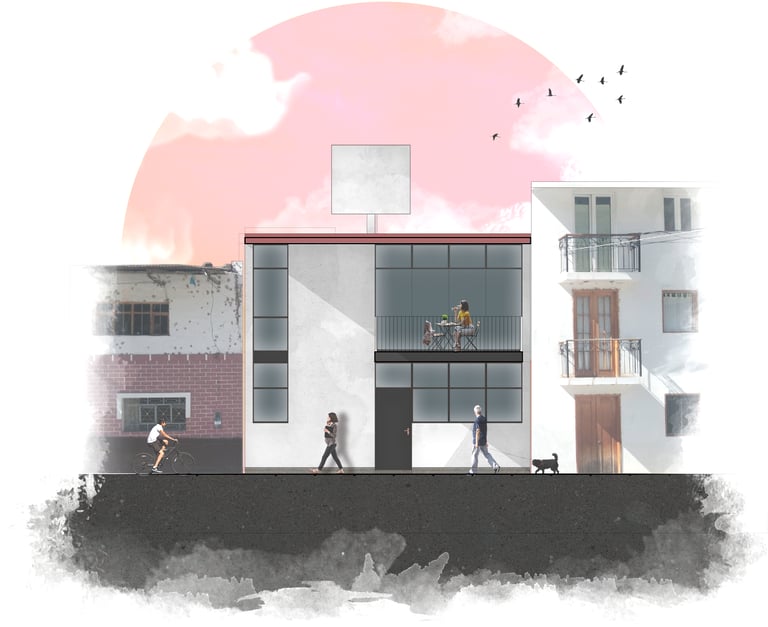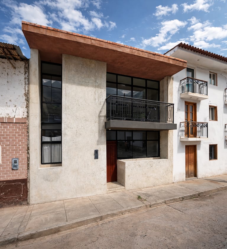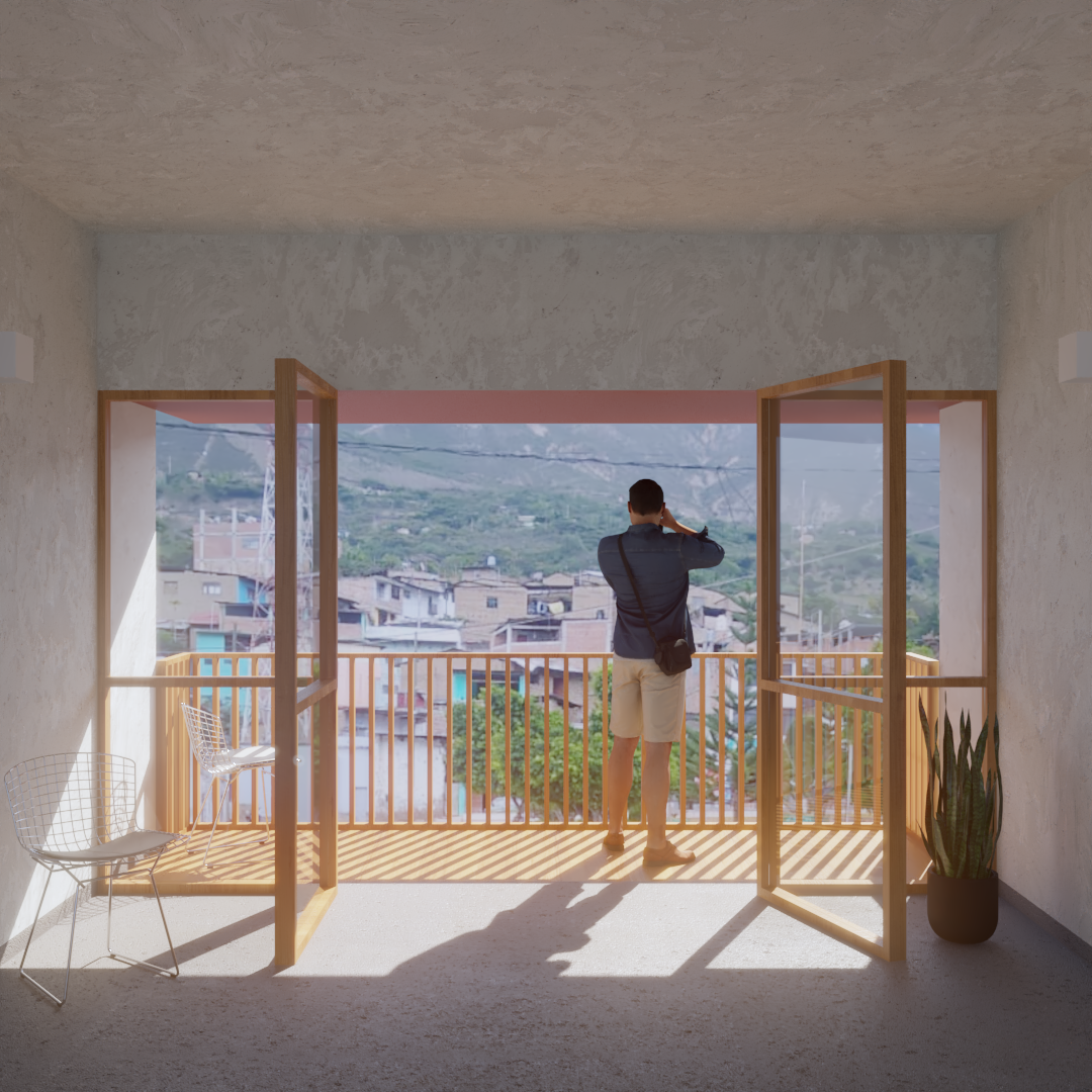 La propuesta, desarrollada en dos niveles, reinterpreta el arquetipo del retablo urbano identificado por Jorge Burga en su libro Vivienda popular en Cajamarca. El diseño organiza una zona social frontal con balcón, concebido como espacio de observación de las festividades de la plaza, y una segunda zona social posterior a doble altura, que establece una relación directa con el entorno natural y el paisaje circundante.