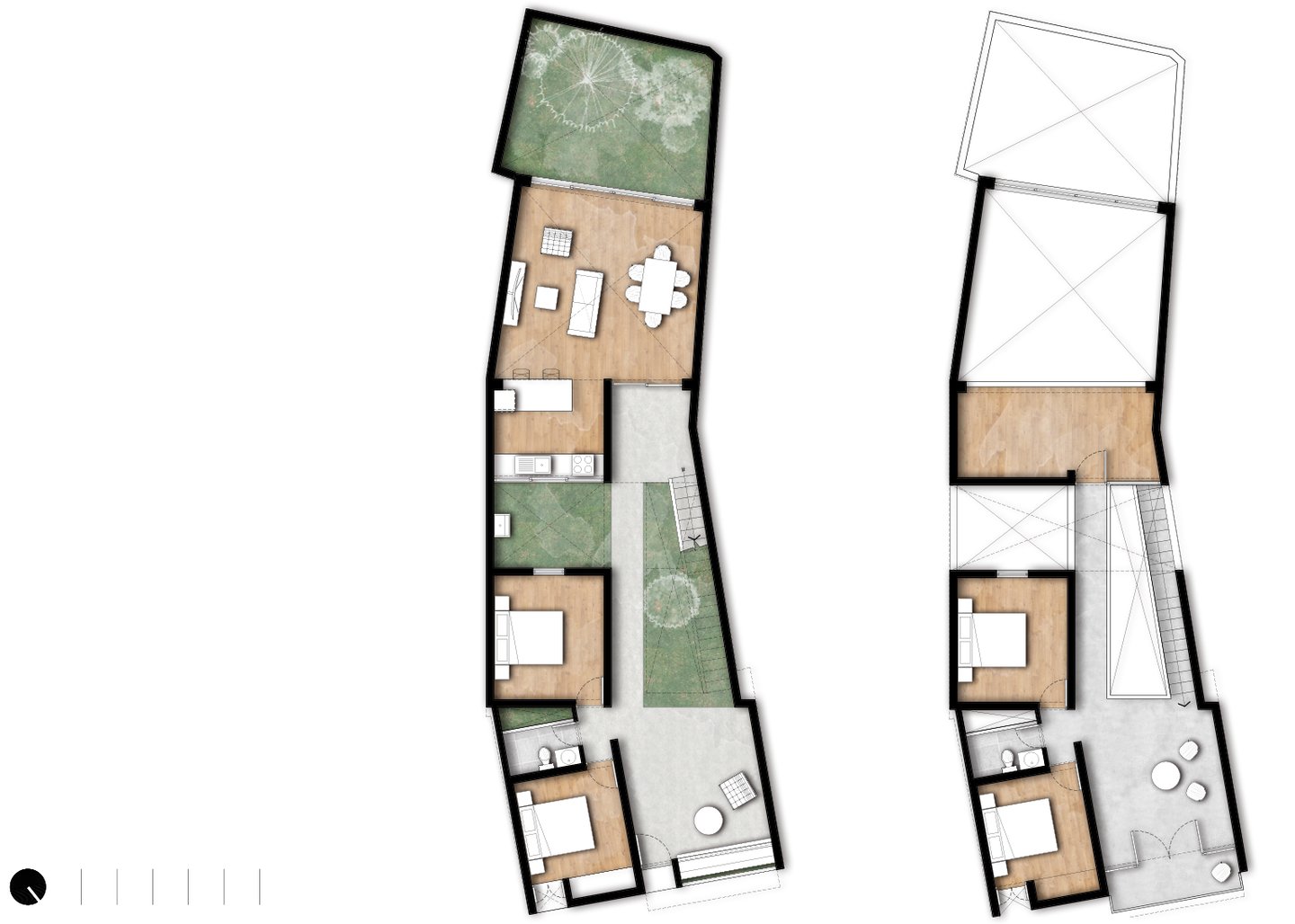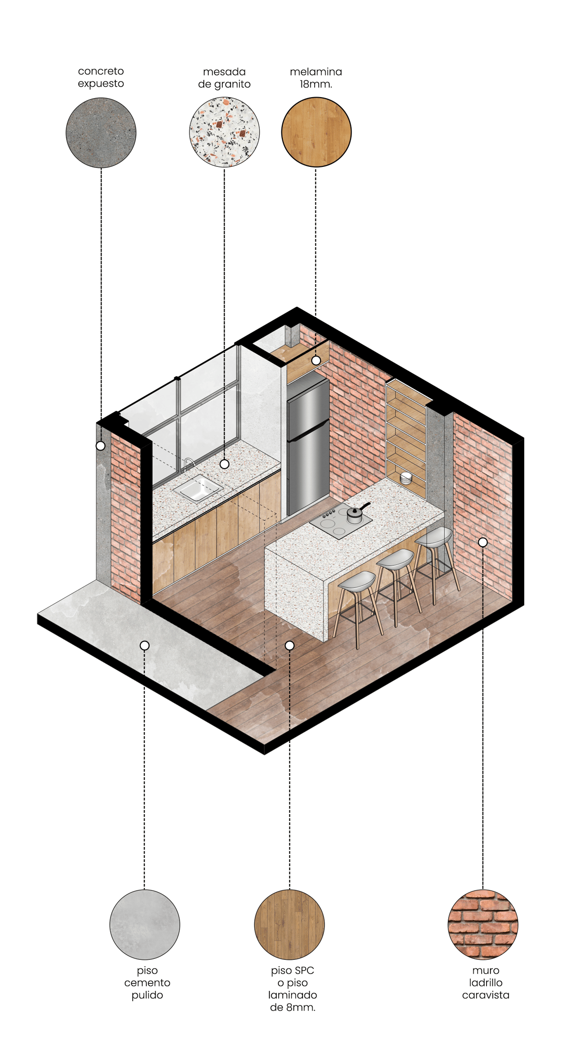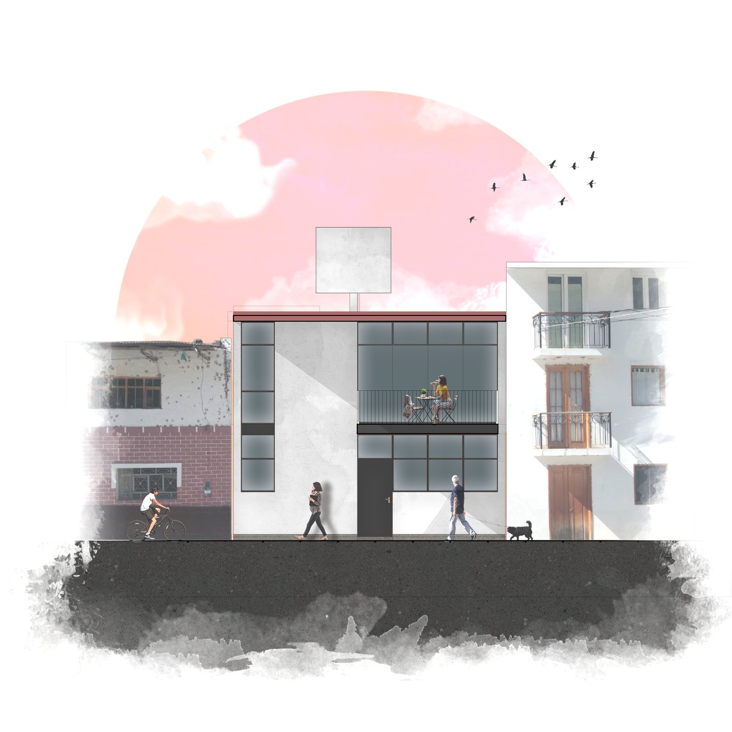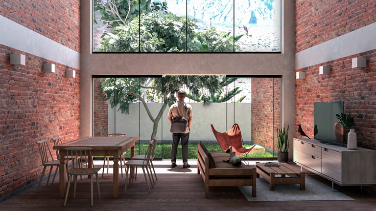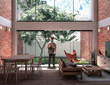 La propuesta, desarrollada en dos niveles, reinterpreta el arquetipo del retablo urbano identificado por Jorge Burga en su libro Vivienda popular en Cajamarca. El diseño organiza una zona social frontal con balcón, concebido como espacio de observación de las festividades de la plaza, y una segunda zona social posterior a doble altura, que establece una relación directa con el entorno natural y el paisaje circundante.